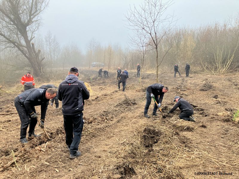 Auftakt war heute eine gemeinsame Aktion von insgesamt 40 Kolleginnen und Kollegen aus dem Amt für Planung und Bau der Hansestadt Stralsund. Im Stadtgebiet Langendorfer Berg haben sie 1.400 Bäume in die Erde gebracht. Dabei wurden die Forstleute von den Hausmeistern und Platzwarten unterstützt, die sonst für die Amtsgebäude, Schulen und Sportanlagen der Stadt zuständig sind.
