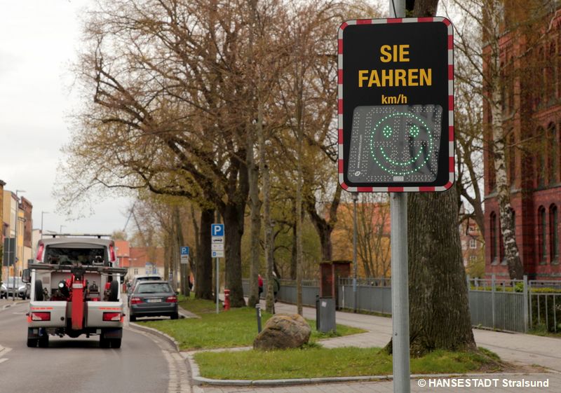 Am 6. Mai hat die Hansestadt Stralsund zwei solarbetrieben Tafeln mit Geschwindigkeitsanzeige installiert. Das sind die, die bei entsprechender Geschwindigkeit auf der Straße ein Smiley mit einem Lächeln zeigen - oder aber auch traurig aussehen bei zu hoher Geschwindigkeit.