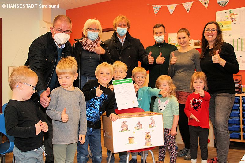 Gleichzeitig rief die Hansestadt Stralsund bei den Kitas zu einem Wettbewerb auf: Wer hat die schönste Sonnenblume? Schließlich acht Kitas übersandten daraufhin ihre Arbeiten. Darunter Zeichnungen und Plakate der Kinder, viele Fotos von der Ansaat, dem Wachsen und Blühen zahlreicher Sonnenblumen, bis hin zu Schilderungen über die Beschäftigungen der Kinder rund um das Jahr, bis zu solchen Themen: Wovon ernähren sich Bienen und wie entsteht Honig. Als Dank erhielten alle acht Kitas heute (11. November) zum Abschluss des Wettbewerbes eine Urkunde und zusätzlich noch eine Überraschung.