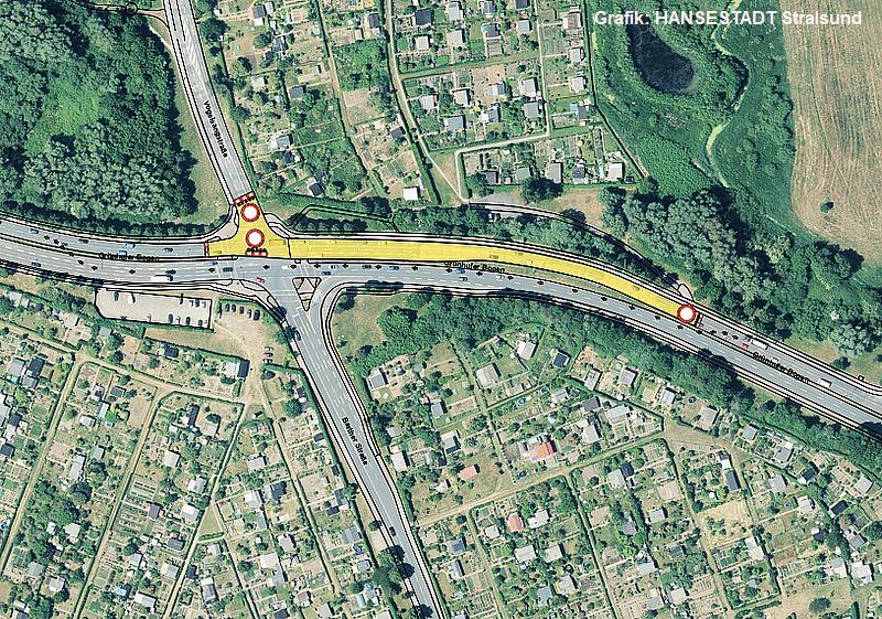 Die Kreuzung Barther Straße/Grünhufer Bogen selber ist dann im Frühjahr des kommenden Jahres dran. Erst dann, weil zwei sehr viel befahrene Kreuzungen in der Stadt nicht gleichzeitig gesperrt sein können. Erst, wenn die Kreuzung Tribseer Damm/Carl-Heydemann-Ring zum Jahresende komplett fertig und freigegeben ist, danach kann nach dem Winter die Kreuzung Barther Straße/Grünhufer Bogen gesperrt werden.
